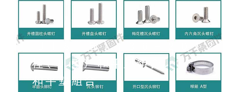 螺栓類:外六角螺栓、外六角法蘭面螺栓、內六角圓柱頭螺栓、吊環螺栓、膨脹螺栓、沉頭內六角螺栓、盤頭內六角螺絲、馬車螺栓、雙頭螺栓、蝶型螺絲、活節螺栓、地腳螺 栓、U型螺栓、四角螺栓等 螺帽類:鉚螺母、吊環螺母、六