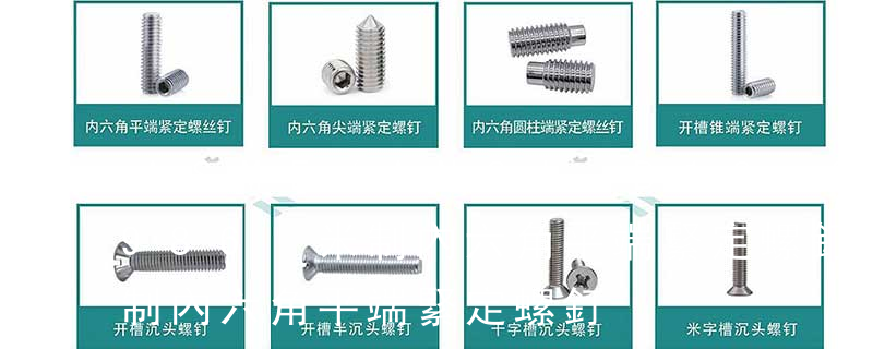 不銹鋼螺絲產品主要有:外六角螺栓、圓柱頭內六角螺釘(杯頭)、內六角凹端緊定螺釘(凹端機米)、內六角平端緊定螺釘(平端機米)、內六角尖端緊定螺釘(尖端機米)、內六角柱端緊定螺釘(柱端機米)、沉頭內六角螺釘(平杯)