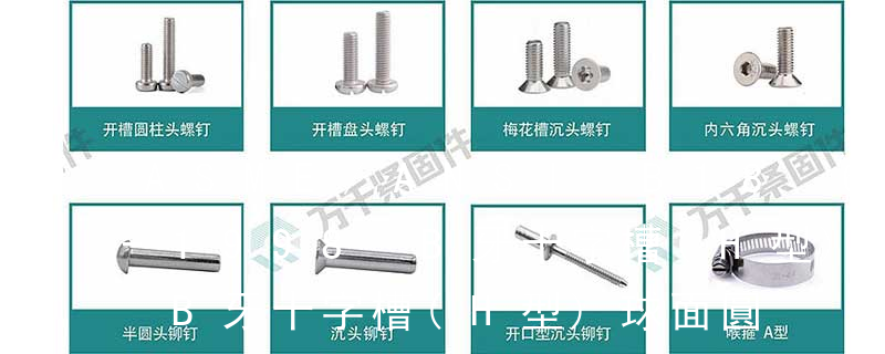 1、Flat:平頭 (鎖入后,頂部與工作件齊平)2、Oval:色拉頭、O頭、半沉頭 3、Round:圓頭 4、Pan:圓扁頭 5、Truss:大圓扁頭 6、Hex:六角頭 A-5:Finish Code/外觀處理。公制自攻螺絲 :于品名后方直接標示 Tapp 外扳擰:六角、六角法蘭面、六角凸緣、六角花形等;內扳擰:一字槽、十字槽H型(Phillips)、十字槽Z型(Pozidriv)、十字槽F型(Frearson)、四方槽(Scrulox)、復合槽、內花鍵、內六角花形(梅花槽)、內三角、內六角